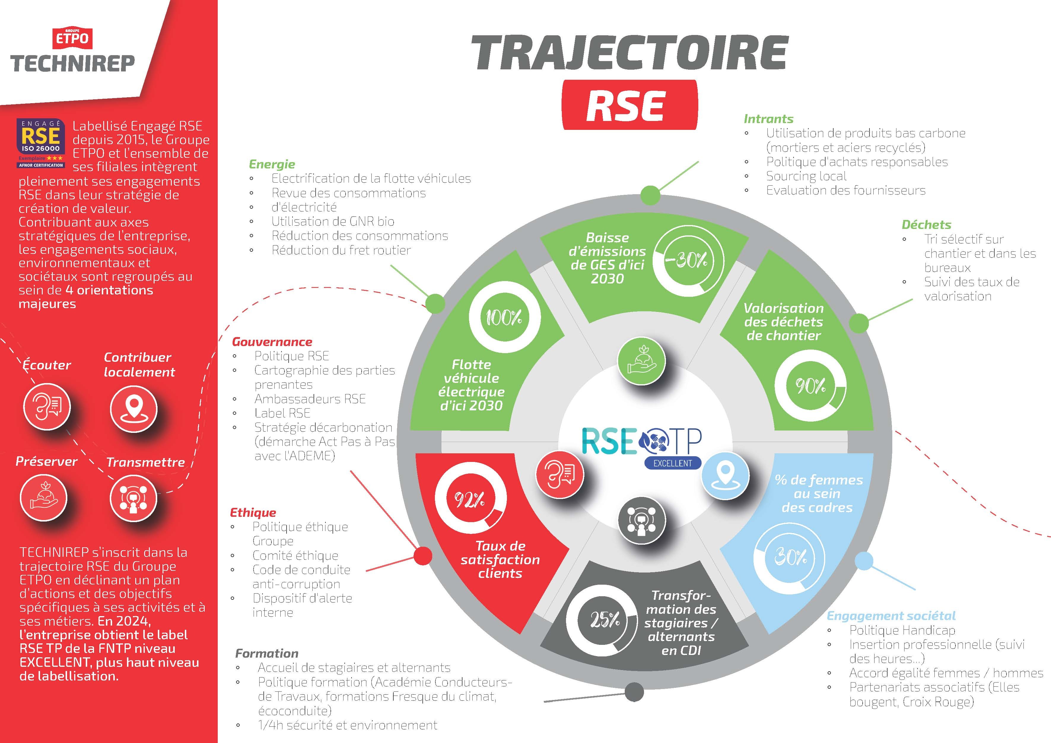 TECHNIREP s’inscrit dans la trajectoire RSE du Groupe ETPO en déclinant un plan d’actions et des objectifs spécifiques à ses activités et à ses métiers. En 2024, l’entreprise obtient le label RSE TP de la FNTP niveau EXCELLENT, plus haut niveau de labellisation